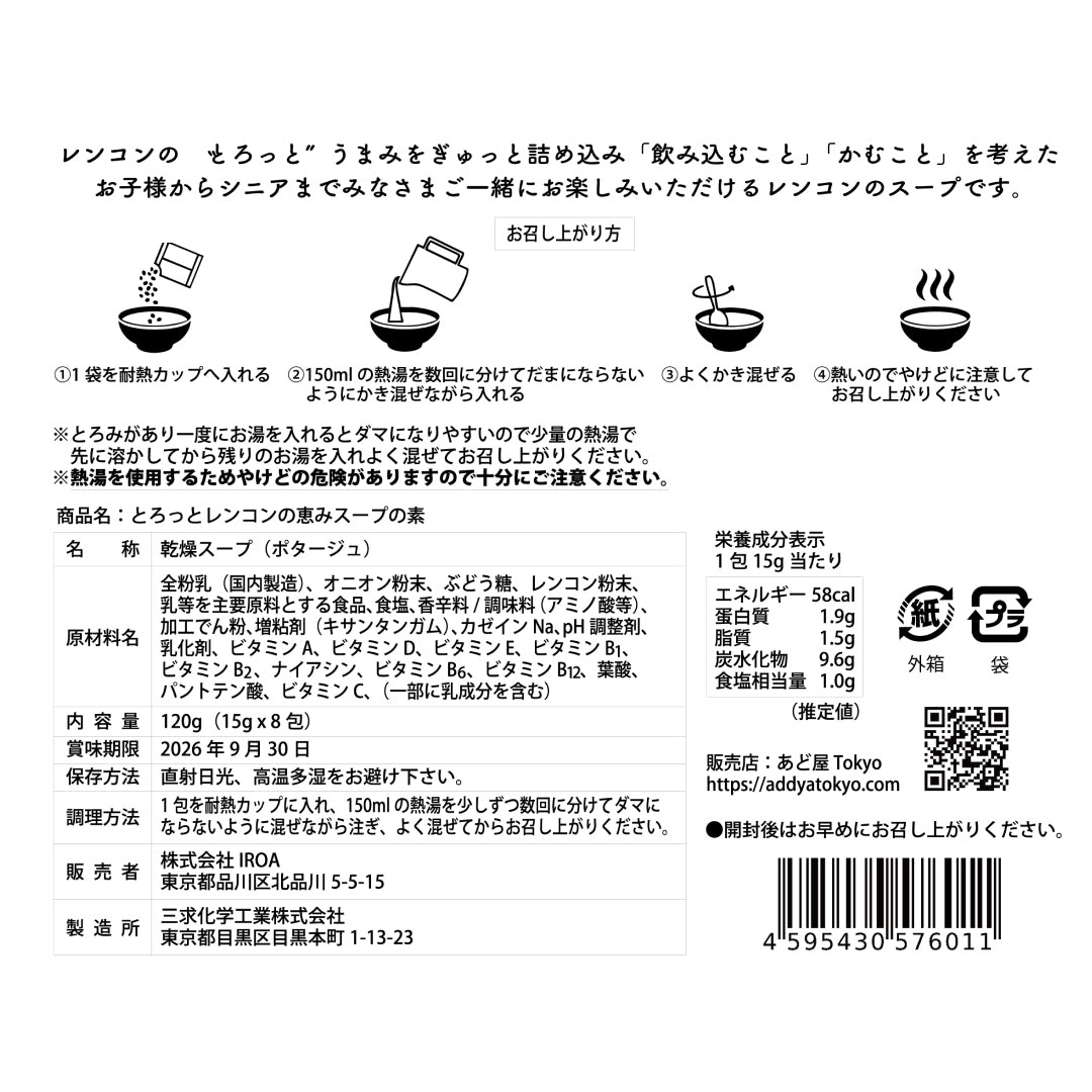 単価 あたりレンコンの”とろっと”うまみをぎゅっと詰め込み「飲み込むこと」「かむこと」を考えた、お子様からシニアまでみなさまご一緒にお楽しみいただけるレンコンのスープです。レンコンのおいしさをやさしいとろみに込めて。